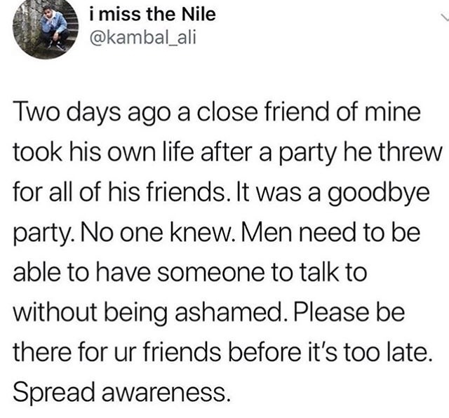 So be there for your friends and family. Tell them what they mean to you. Let them talk to you without fear of judgement. LISTEN. Suggest people get help if you think they need it.