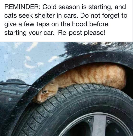 Please don’t skip over this without reading it and making a mental note. Even if you don’t have a car, tell your parents or whoever, and make sure to do this. You think that’ll never happen but that’s what everyone thought who had this happen and didn’t check, and that poor cold cat met with a terribly sad end.